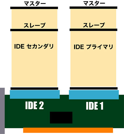 左記のような構成になる。マスター・スレーブはケーブルの記述通りに入れたが、
