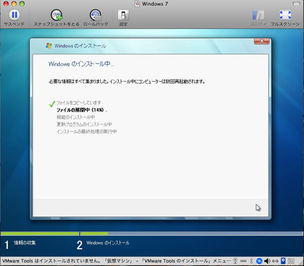 VMWareFusionで2CPU,メモリー1024MBで実行してみました。